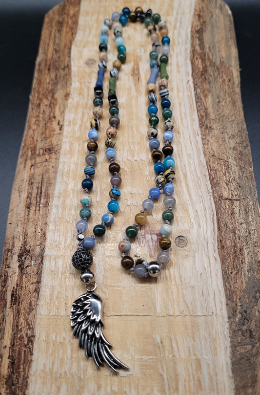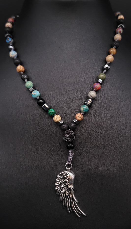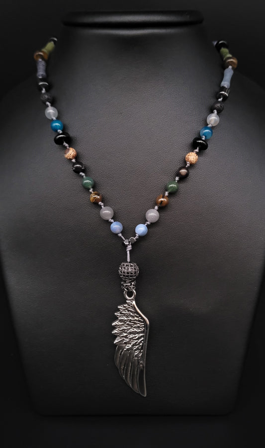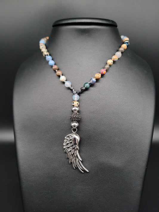 U-HESK-1004 Halbedelsteinkette geknüpft mit Edelstahl Engelsflügel-Anhänger - UNIKAT