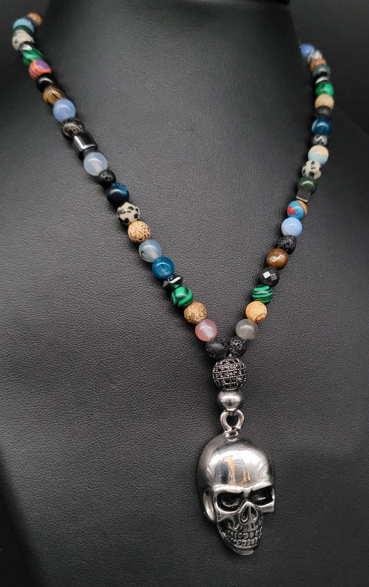 U-HESK-1007 Halbedelsteinkette mit Skull-Anhänger UNIKAT