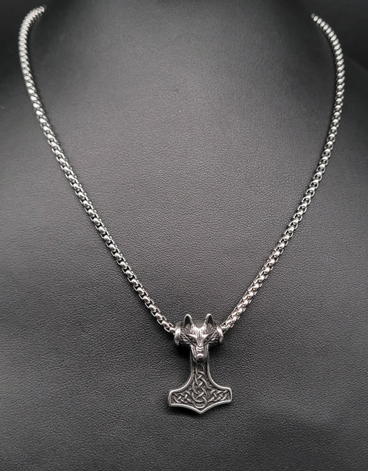 HKE-1013 Edelstahlkette mit kleinem Thorhammer und Wolfkopf