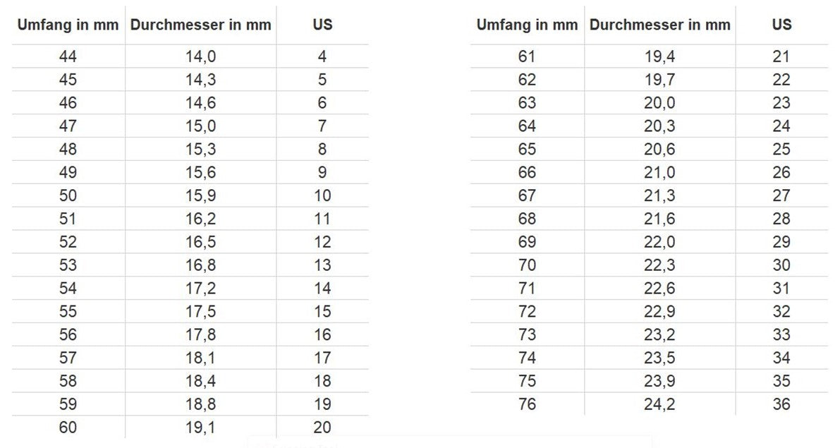 Falls Sie sich bezüglich Ihrer Ringgröße unsicher sind, finden Sie in der bereitgestellten Tabelle auf der linken Seite eine Übersicht zur Ermittlung Ihrer passenden Ringgröße.